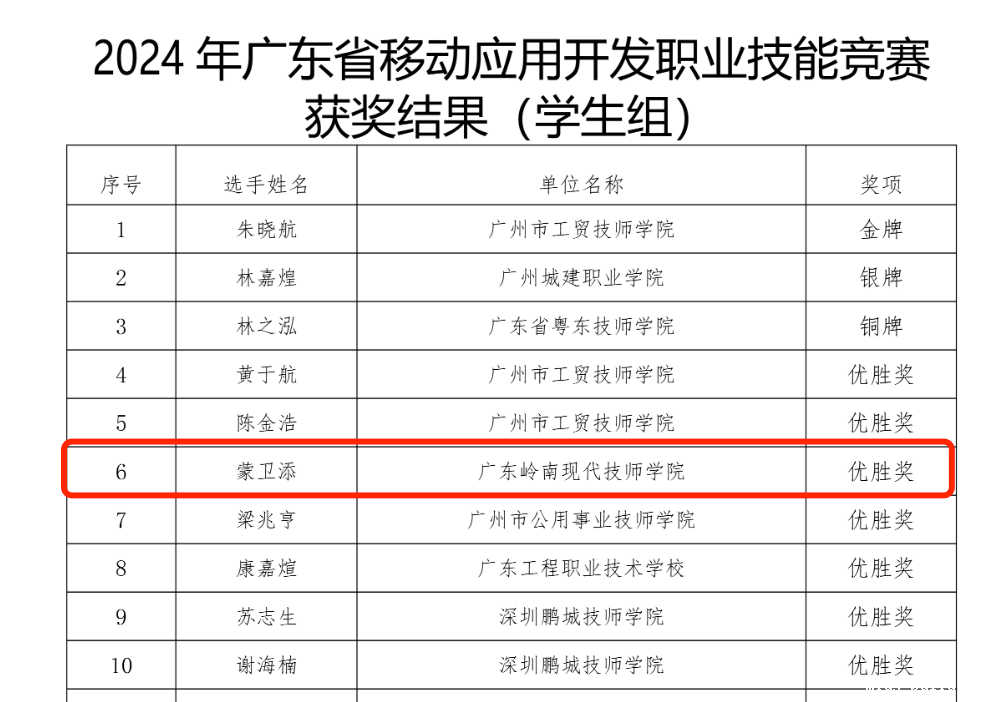 喜讯丨广东岭南现代技师学院学子在2024年广东省移动应用开发职业技能竞赛中获奖!