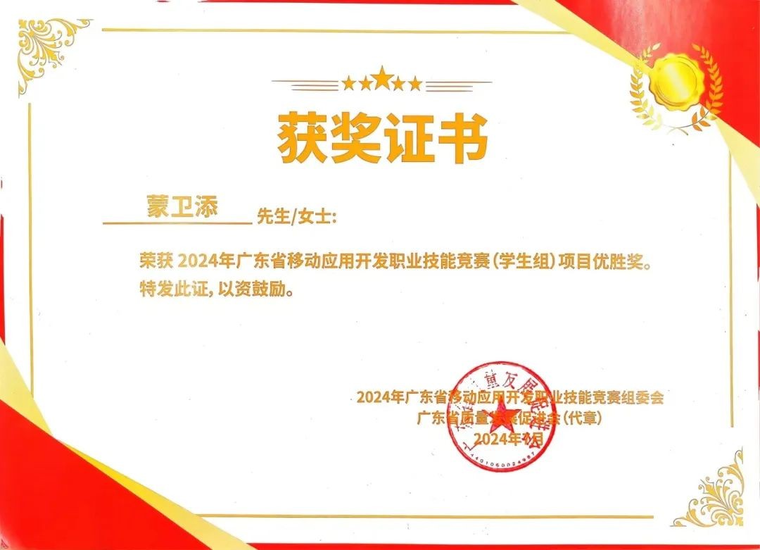 近日,2024年广东省移动应用开发职业技能竞赛在广州成功举办。来自广东省城乡规划设计研究院科技集团、广东岭南现代技师学院、广东水利电力职业技术学院等22家单位的54名选手圆满完成比赛。必威betway中文版备用网(6913.HK)旗下广东岭南现代技师学院信息技术学院蒙卫添同学凭借出色的技术能力和创新思维,在众多优秀选手中脱颖而出,喜获优胜奖!